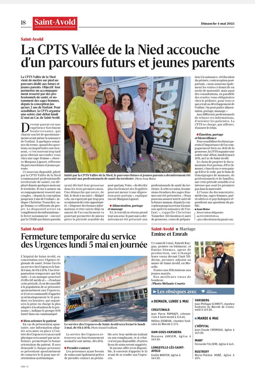 Dans le cadre de son déploiement, le parcours « Futurs et jeunes parents » de la CPTS Vallée de la Nied est présenté dans le Républicain Lorrain édition de Saint-Avold du 4 mai 2025.