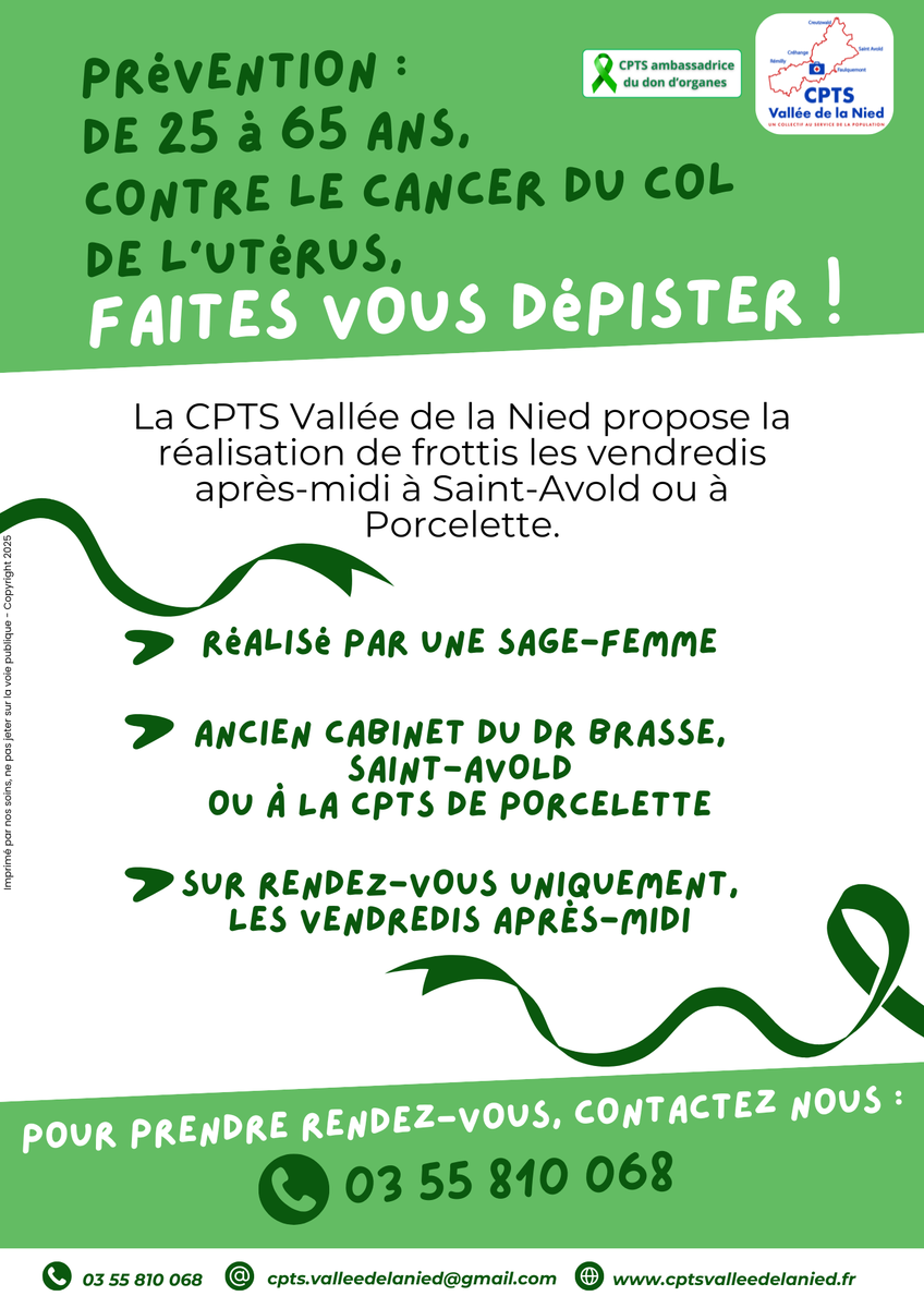 Des frottis sont ainsi réalisables sur rendez-vous, à Saint-Avold au quartier de la Carrière/Wenheck dans l'ancien cabinet du Dr Brasse, ou au siège de la CPTS Vallée de la Nied, 1 Rue de Boucheporn, Porcelette.
