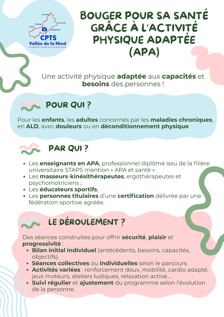 Sur le territoire, de nombreuses structures proposent des activités physiques accessibles et adaptées à tous les profils : que vous soyez en bonne santé, atteint d’une maladie chronique ou en reprise d’activité après un problème de santé. La CPTS Vallée de la Nied met à votre disposition, en collaboration avec les partenaires locaux, un livret de recensement de l’offre APA/Sport-Santé sur le territoire (bientôt disponible en ligne).